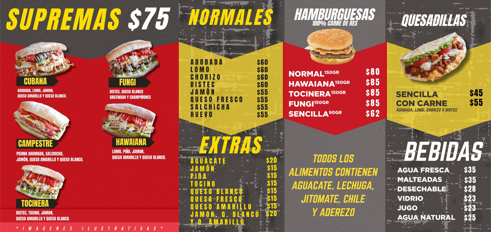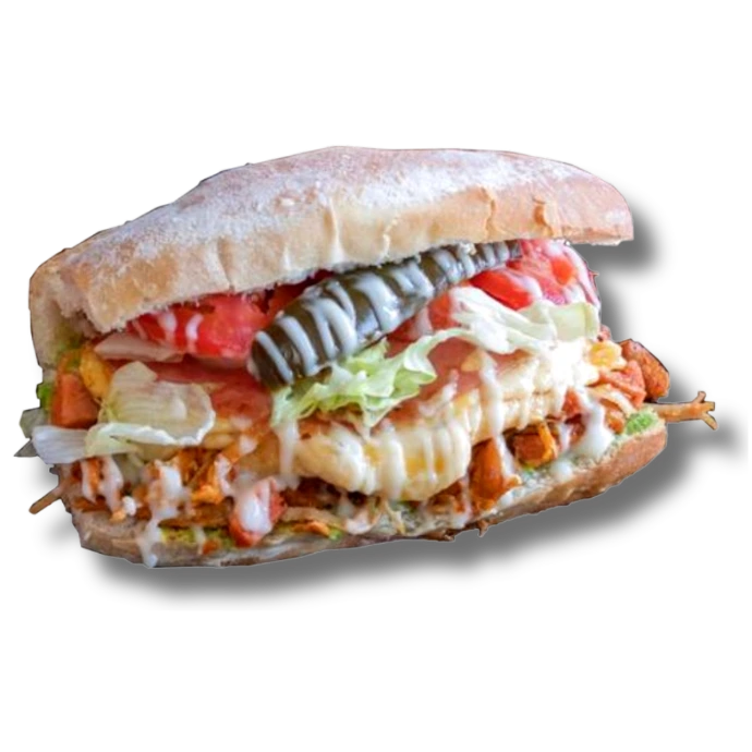 Una de las más completas y favoritas del menú. Lleva adobada, lomo, salchicha, jamón, queso amarillo y queso blanco, con aguacate, lechuga, jitomate, chile y aderezo. Grande en sabor, bien llenadora y perfecta para quienes lo quieren todo.
